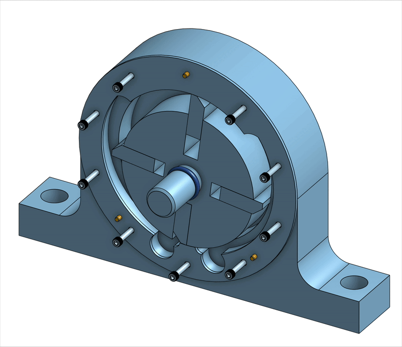 This project was completed for the ‘Manufacturing Processes for Design and Production’ course at Boston University. The goal of the project was to design a rotary vane pump to be used with drinking water containing fluoride and chlorine, in an outdoor setting with a MTBF of 2 years at a 50% duty cycle. I was in charge of material selection for the different components coming in contact with the drinking water, as well as the dimensioning of slots and clearance holes for the different fasteners including dowel pins and socket head cap screws, accounting for wrench clearance as well. I also was in charge of modelling the parts, creating an assembly, and producing some of the engineering drawings in OnShape.